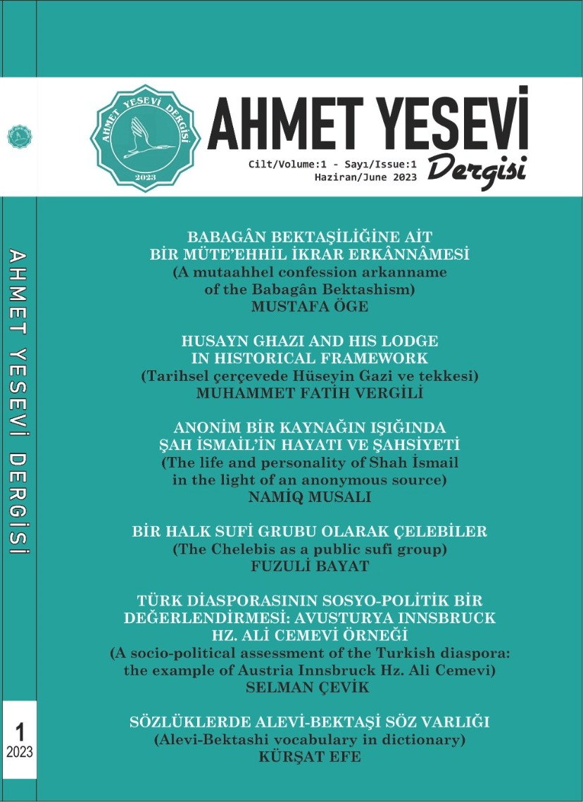 2024 AHMET YESEVİ DERGİSİ SAYI : 3 AHMET YESEVİ DERGİSİ SAYI : 4 AHMET YESEVİ DERGİSİ SAYI : 4 2023 AHMET YESEVİ DERGİSİ SAYI-1 AHMET YESEVİ DERGİSİ SAYI : 2 BABAGÂN BEKTAŞİLİĞİNE AİT BİR MÜTE’EHHİL İKRAR ERKÂNNÂMESİ Mustafa ÖGE PDF HUSAYN GHAZI AND HIS LODGE IN HISTORICAL FRAMEWORK Muhammet Fatih VERGİLİ PDF ANONİM BİR KAYNAĞIN IŞIĞINDA ŞAH İSMAİL’İN HAYATI VE ŞAHSİYETİ Namiq MUSALI PDF